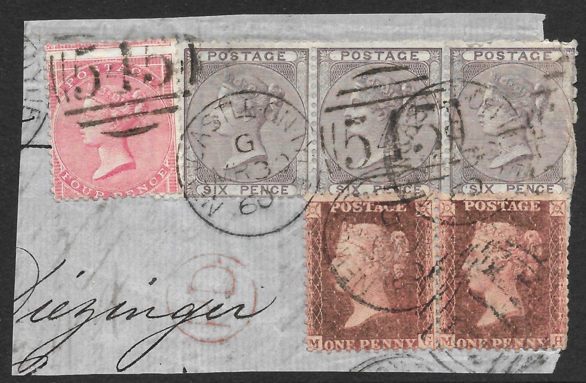 GREAT BRITAIN – Q.V 1860 WITH 4d x1 AND 6d x3 IN STRIP + 2x1d RED STARS ON PIECE