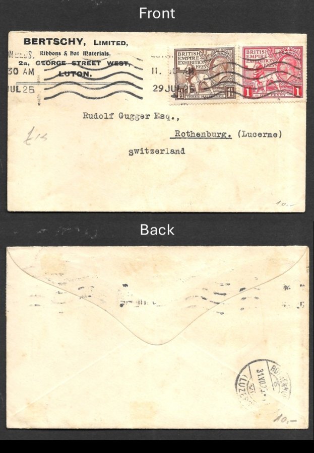 GREAT BRITAIN – 1925, 1d AND 1½d ON ENVELOPE WEMBLEY SET ADD ON LUTON FIRM TO SWIZ DATED 29 JULY 25 FILLER, SG 432-3, USED