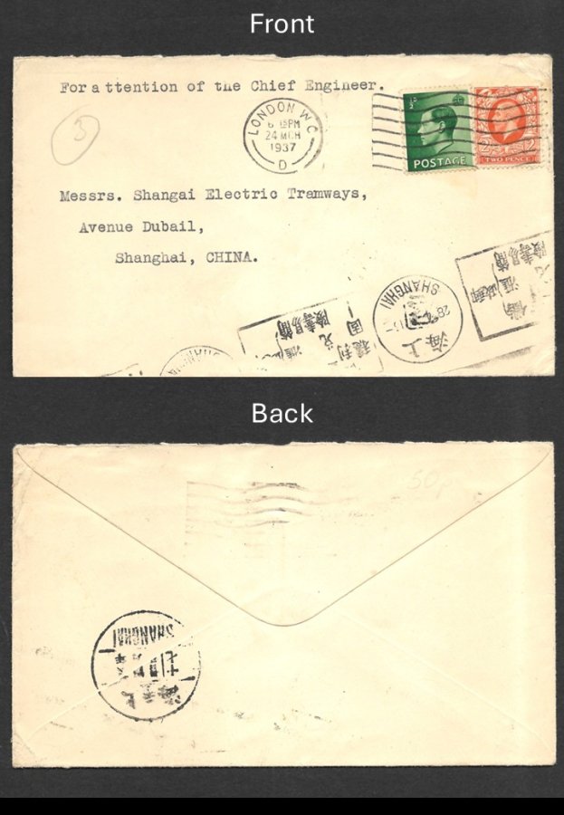 GREAT BRITAIN TO SHANGHAI – 1937, ½d GREEN KEVII AND 2d ORANGE KGV ON ENVELOPE TO SHANGHAI ELECTRIC TRAMWAYS VARIOUS P/M, SG 442 & 457, USED