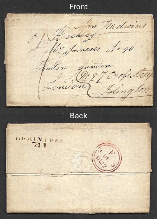 GREAT BRITAIN – 1827, ENTIRE LONG LETTER P/M 1822 AND BRAINTREE ON BACK AND ADDRESS ISLINGTON OF FRONT, USED